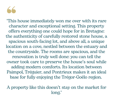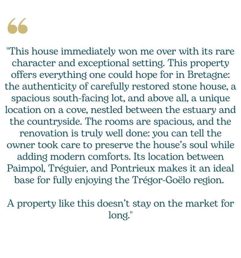 A rare property on the market that beautifully combines the authenticity of local heritage with modern comfort, in a wonderfully preserved natural setting. Close to Tréguier, Paimpol and Pontrieux, this character property captivates with its timeless charm, generous volumes and the high quality of its renovation carried out by local craftsmen.