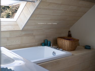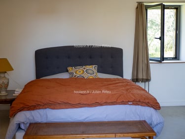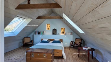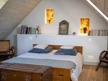 À ce niveau, une très belle suite parentale accueille une salle de bains avec baignoire et WC indépendant. Le plancher ancien et les pierres apparentent donnent à cet espace une atmosphère cosy. Les velux offrent une vue imprenable sur la verdure du jardin.