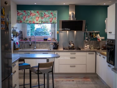 Le cœur de la maison bat au rez-de-chaussée, où une cuisine équipée s'ouvre harmonieusement sur un salon convivial avec sa grande baie vitrée donnant sur le jardin paysager. L'insert à bois apporte une touche chaleureuse à cet ensemble.