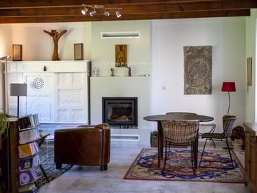 Carrelage en grès - Cheminée insert - Radiateurs radiants faible consommation - Isolation sous lambris pour les combles
